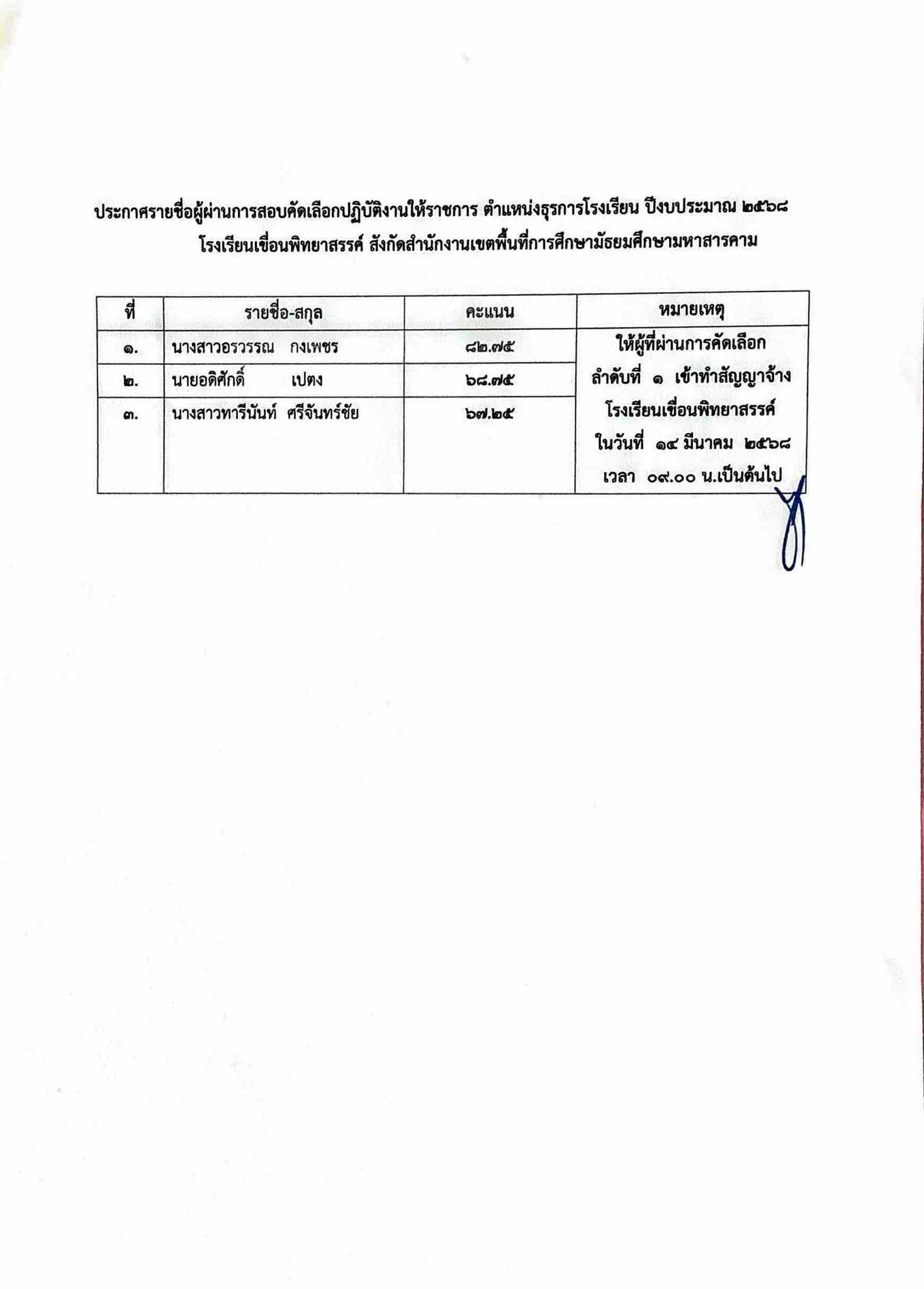 ประกาศรายชื่อผู้ผ่านการสอบคัดเลือกปฏิบัติงานให้ราชการ ตำแหน่งธุรการโรงเรียน ปีงบประมาณ 2568