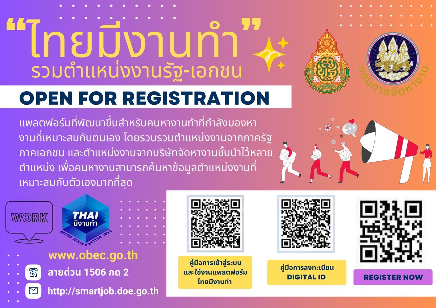 ข่าวประชาสัมพันธ์ สำหรับนักเรียน นักศึกษาและบุคคลทั่วไปที่กำลังหางานทำ สามารถขึ้นทะเบียนหางานในแพลตฟอร์ม "ไทยมีงานทำ" เพื่อเพิ่มโอกาสในการมีงานทำระหว่างการสึกษา หรือหลังจบการศึกษา "ไทยมีงานทำ" รวมตำแหน่งงานรัฐบาล - เอกชน แพลตฟอร์มที่พัฒนาขึ้นสำหรับคนหางาน ที่กำลังมองหางานที่เหมาะสมสำหรับตัวเอง โดยรวบรวมตำแหน่งจากบริษัทจัดหางานชั้นนำวางไว้หลายตำแหน่งเพื่อคนหางานสามารถค้นหาข้อมูลตำแหน่วที่เหมาะสมสำหรับตัวเองมากที่สุด